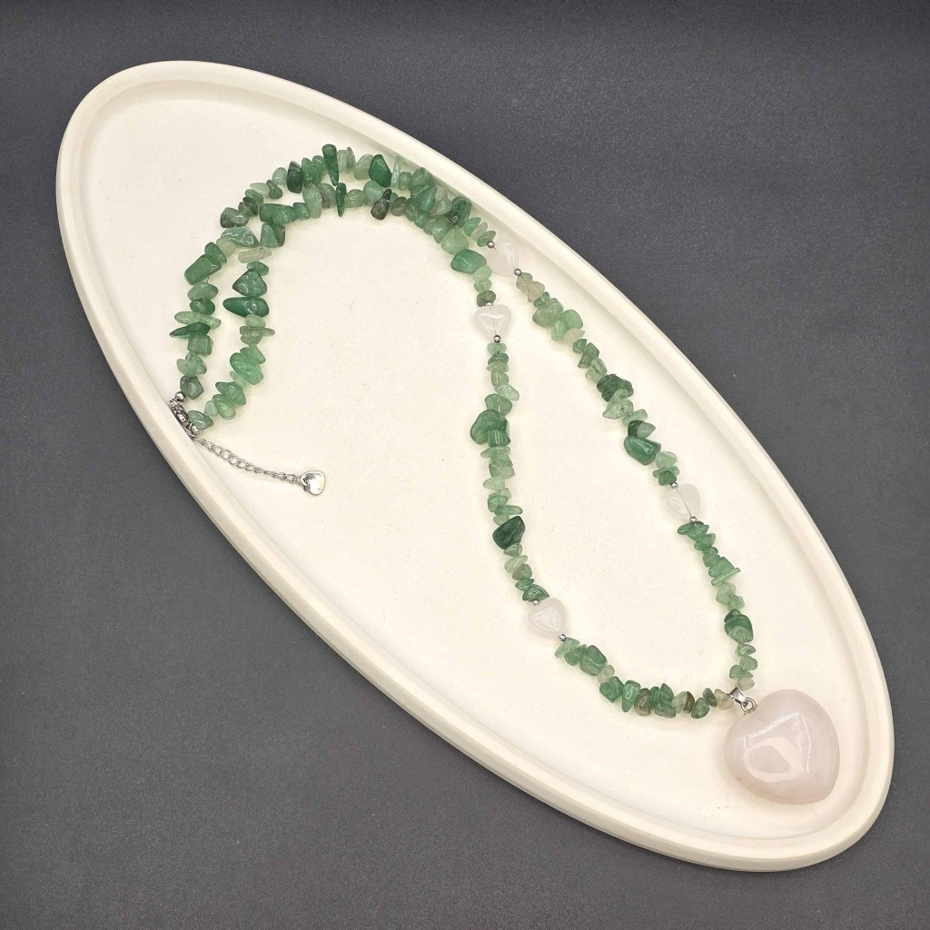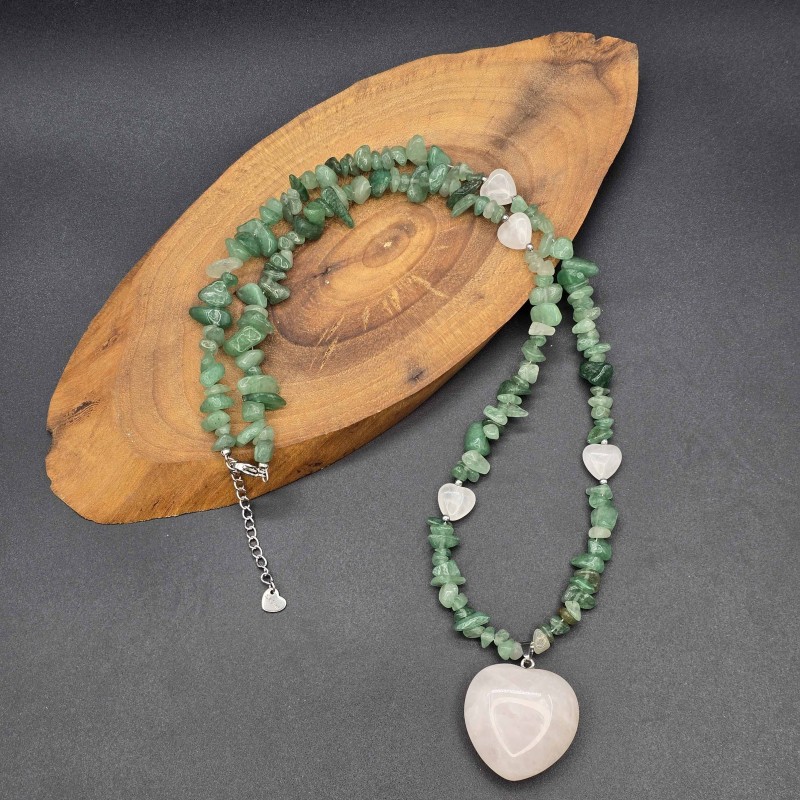 گردنبند اونتورین نامنظم و قلبهای کوارتز صورتی