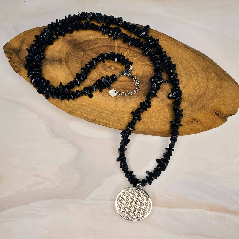 گردنبند تورمالین سیاه نامنظم با گل زندگی نقره ای