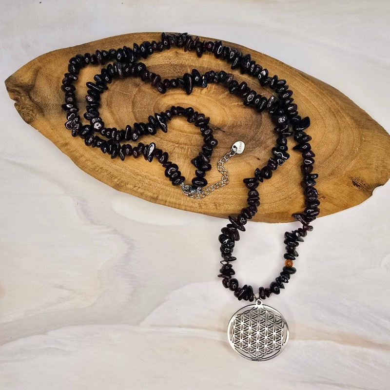 گردنبند گارنت سرخ نامنظم با گل زندگی نقره ای