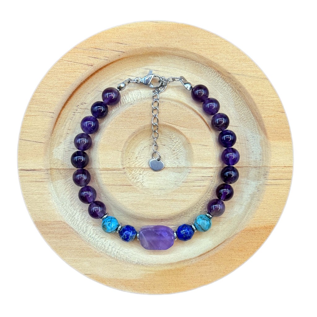 -پلاک آمیتیست در مرکز- لاجورد تراش خورده سایز 6- فیروزه سایز 6-بین مهره ها حدید-امیتیست سایز 6 تیره -متریال تمام استیل رنگ ثابت ضد حساسیت