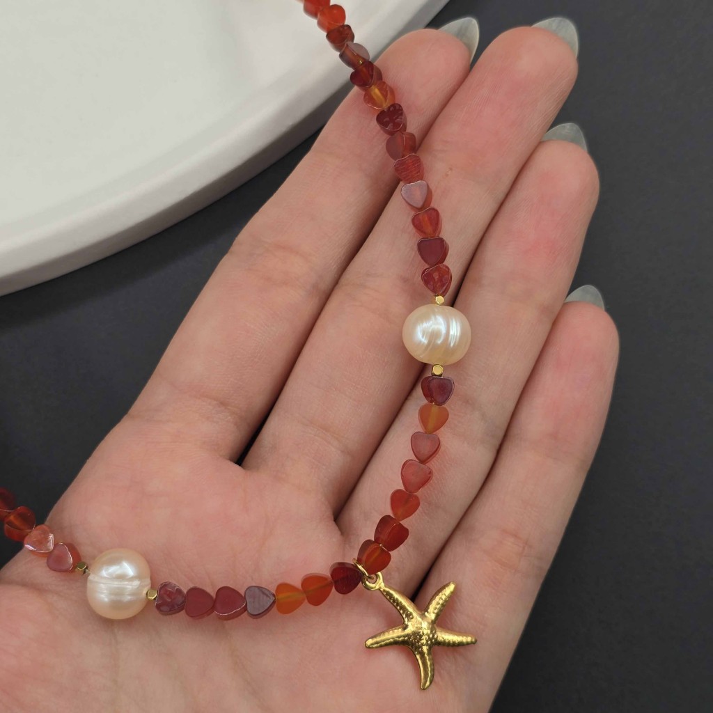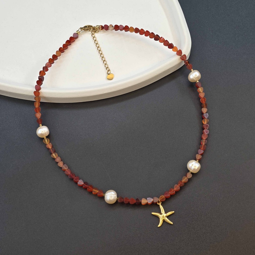 گردنبند عقیق قلبی با مروارید صورتی نامنظم طبیعی پرورشی و پلاک ستاره دریایی استیل