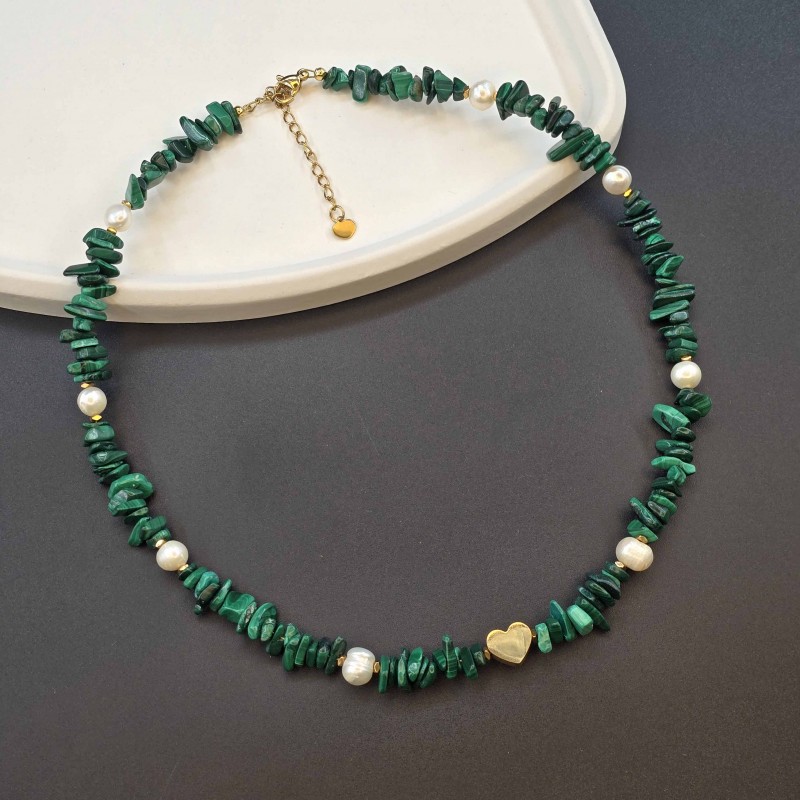 گردنبند مالاکیت نامنظم با مروارید طبیعی پرورشی و پلاک قلب استیل