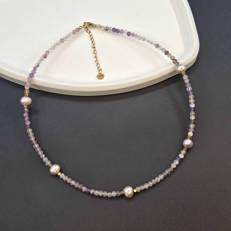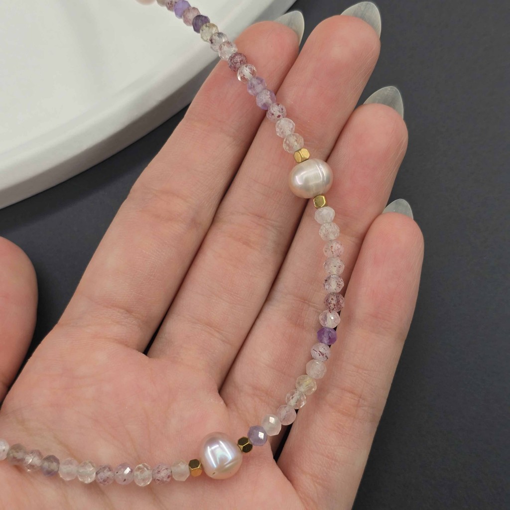 گردنبند کوارتز مولتی کالر تراش با مروارید بنفش طبیعی پرورشی
