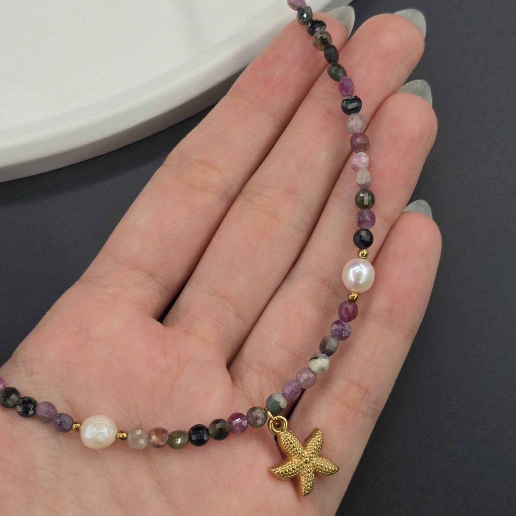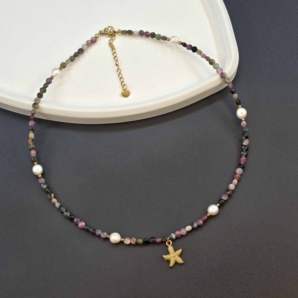 گردنبند تورمالین مولتی کالر تراش با مروارید نامنظم طبیعی پرورشی و پلاک ستاره دریایی استیل