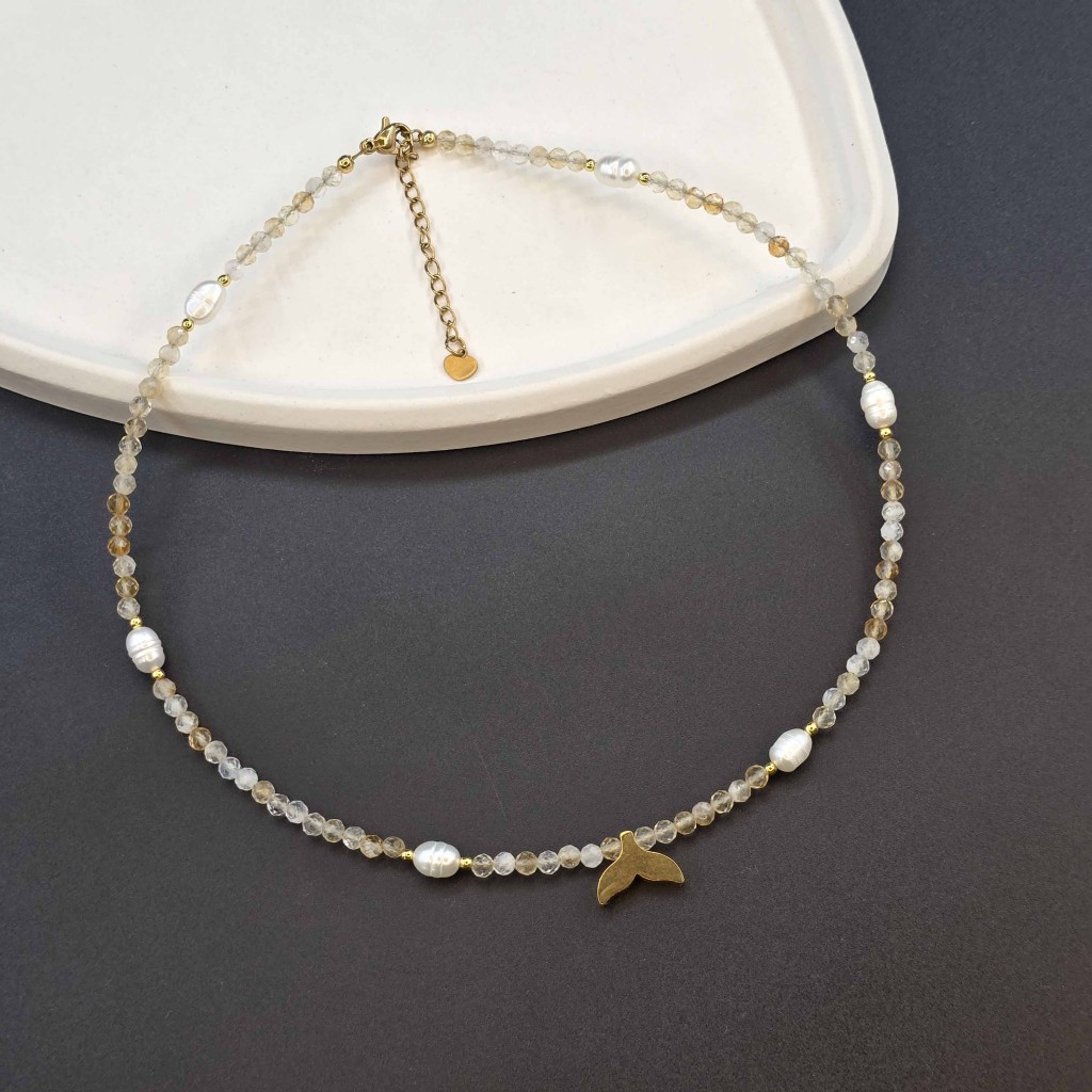 گردنبند سیترین تراش با مروارید نامنظم طبیعی پرورشی و پلاک دم وال استیل