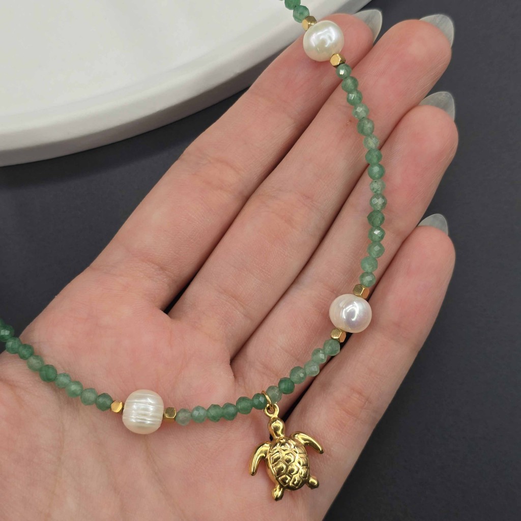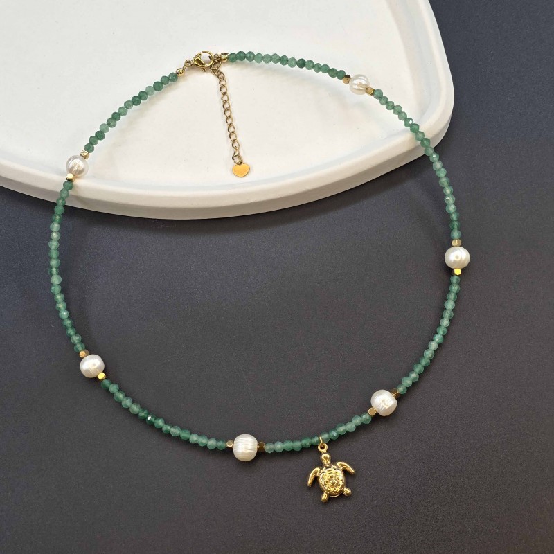 گردنبند اونتورین تراش با مرواریدطبیعی پرورشی و پلاک لاکپشت استیل