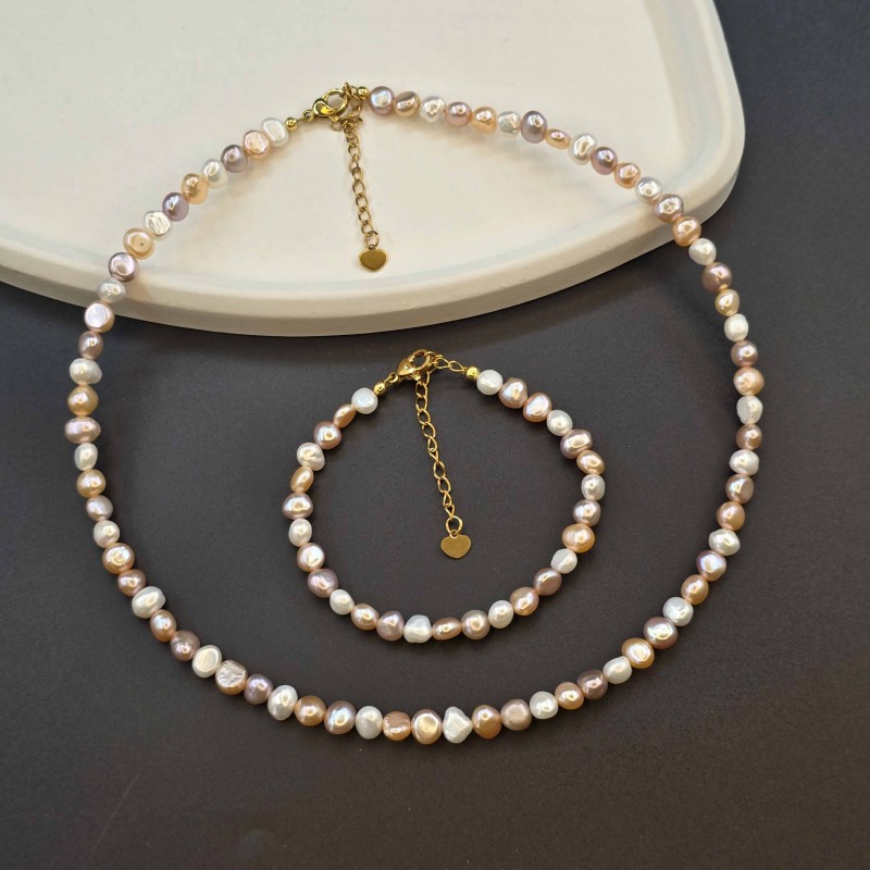 ست گردنبند و دستبند مروارید پرورشی مولتی کالر نامنظم سایز 1