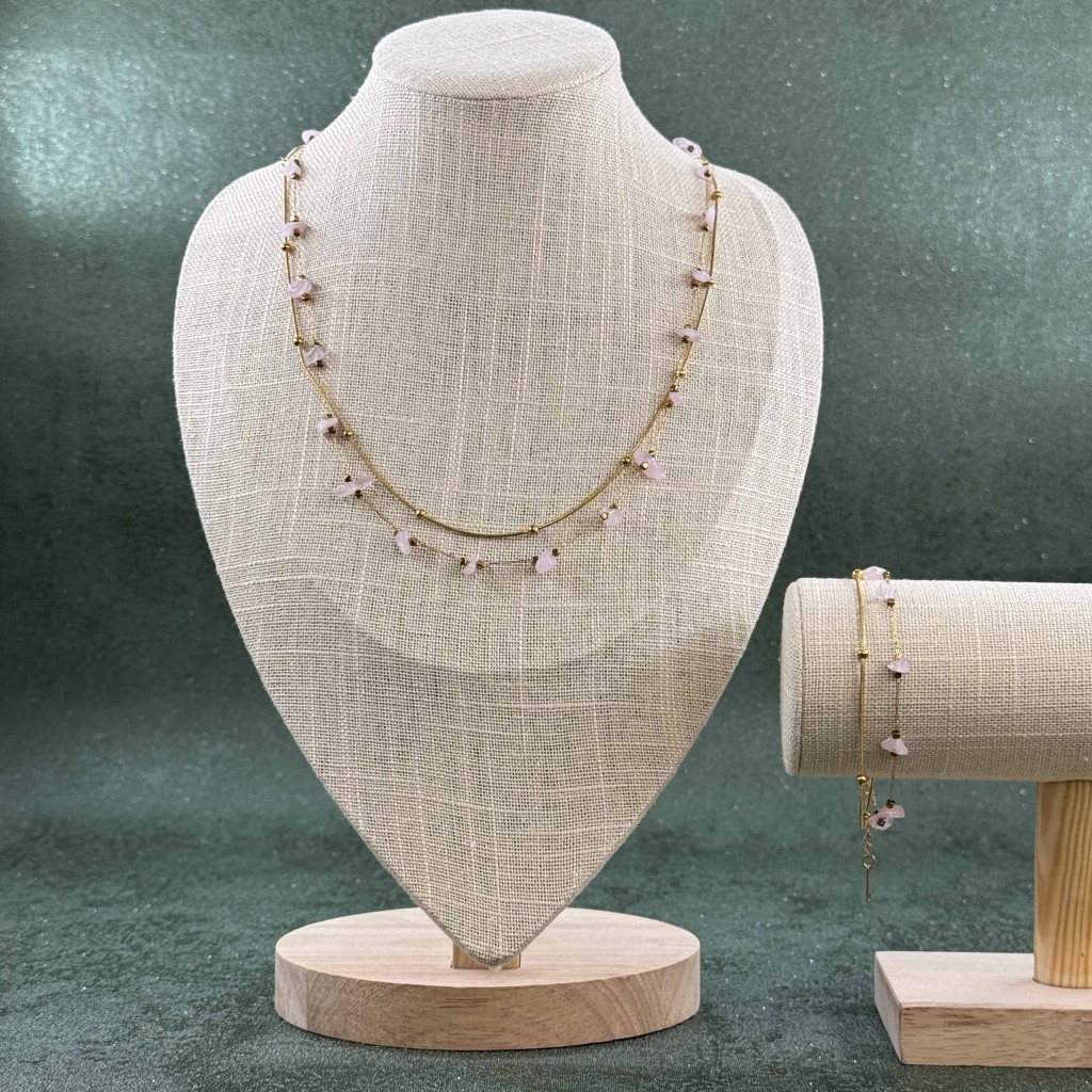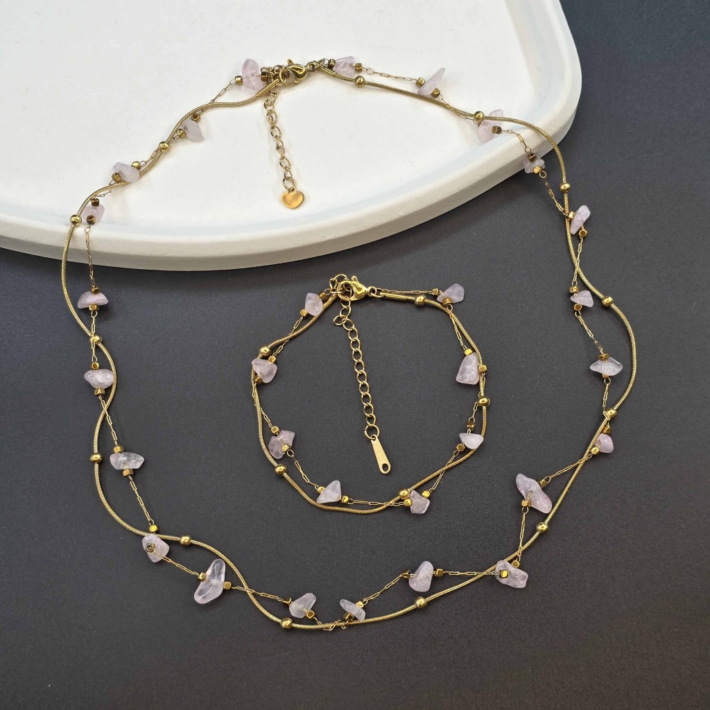 ست گردنبند و دستبند سنگ کوارتز صورتی زنجیری