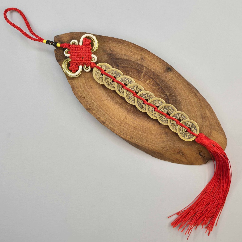 ترکیب سکههای نمادین با گره فنگشویی، انرژی ثروت، عشق، طول عمر و سعادت را در محیط تثبیت کرده و از ورود انرژیهای منفی جلوگیری میکند.