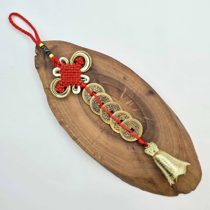 رشته 5 سکه فنگشویی با زنگوله و گره عشق قرمز