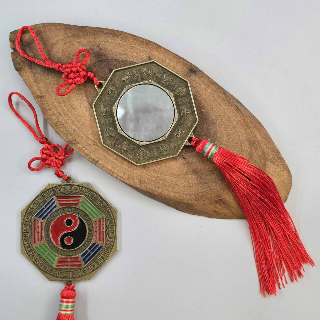 - اینه پاکوای فلزی دو طرفه است اگر نیاز دارید برای داخل بنا از این آینه استفاده کنید، به سمت نماد یین و یانگ قرار دهید.