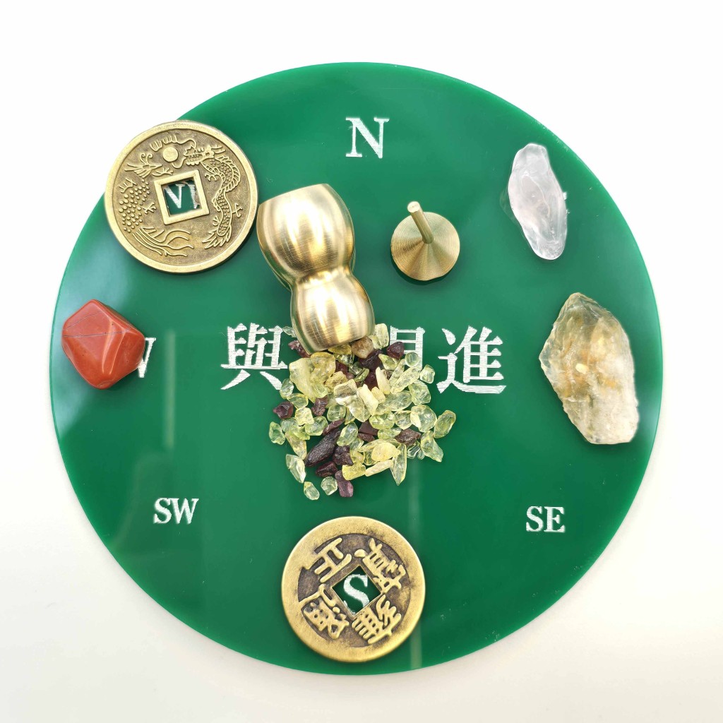 - شامل صفحه تکنیک طلوع به رنگ سبز به قطر 10 سانت با جهات جغرافیایی-سنگ کوارتز صورتی و جاسپر سرخ و سیترین- سکه ایچینگ و ققنوس اژدها- کدو قلیانی برنجی که داخل آن با سنگها ثروت ( سیترین-زبرجد و گارنت )پر شده است.