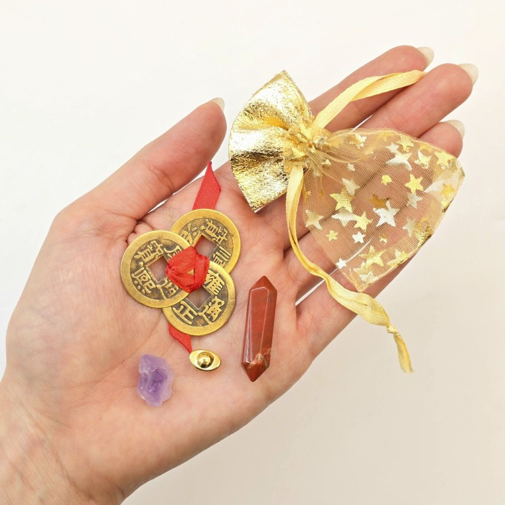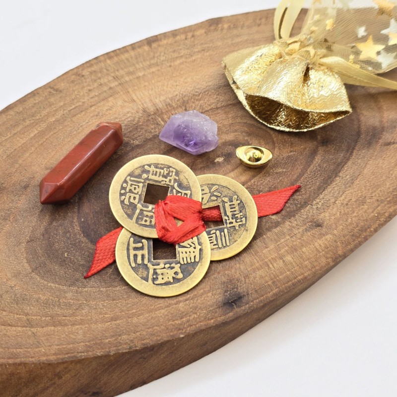 شامل سه سکه فنگشویی با گره قرمز - یک عدد امیتیست راف- یک عدد سنگ جاسپر سرخ منشوری-یک عدد کشکول ثروت ریز برنجی و کیسه طلایی برای حمل آسان همراه خود