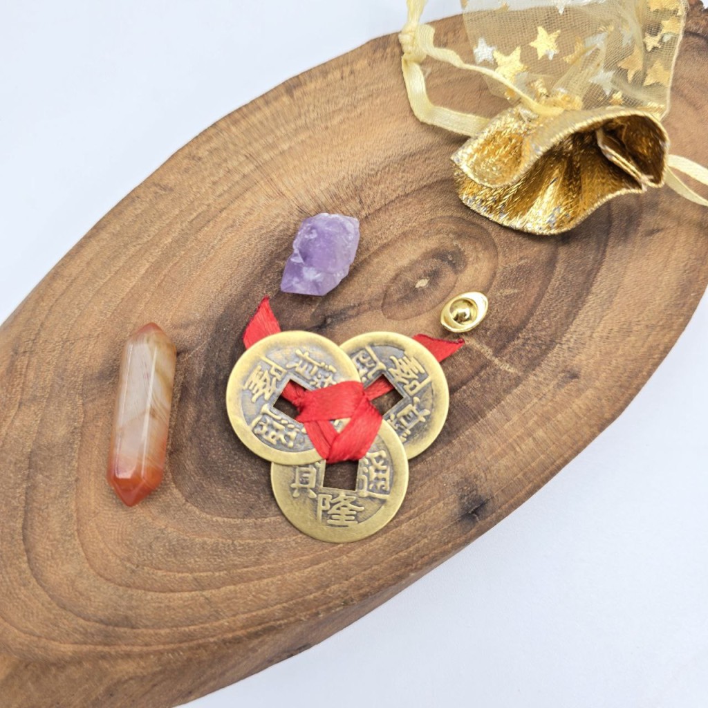 -مناسب سال اسب 2026شامل سه سکه فنگشویی با گره قرمز - یک عدد امیتیست راف- یک عدد سنگ عقیق سرخ منشوری-یک عدد کشکول ثروت ریز برنجی و کیسه طلایی برای حمل آسان همراه خود