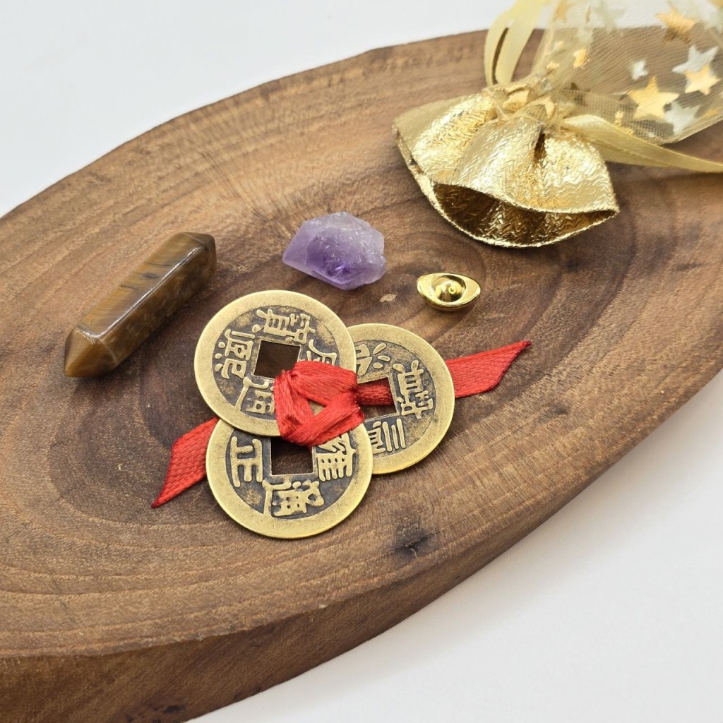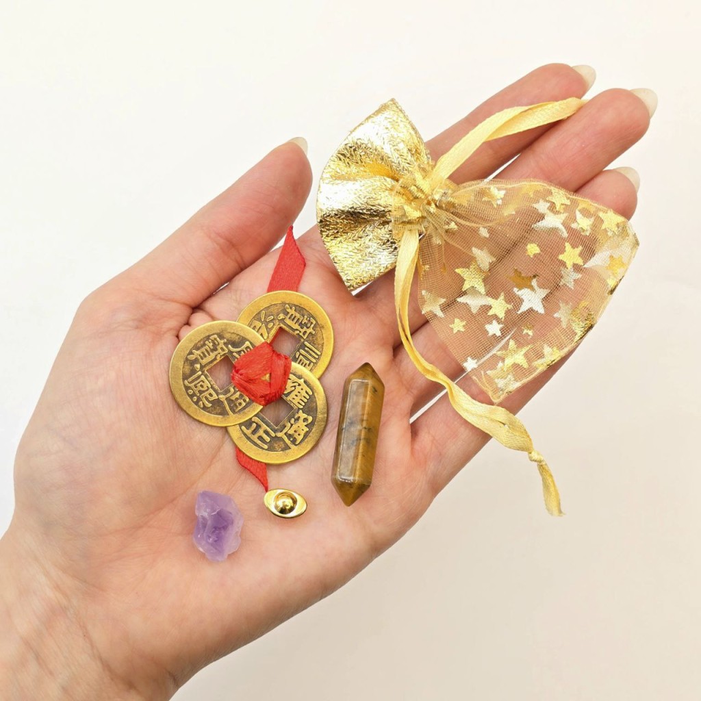 شامل سه سکه فنگشویی با گره قرمز - یک عدد امیتیست راف- یک عدد سنگ چشم ببر منشوری-یک عدد کشکول ثروت ریز برنجی و کیسه طلایی برای حمل آسان همراه خود