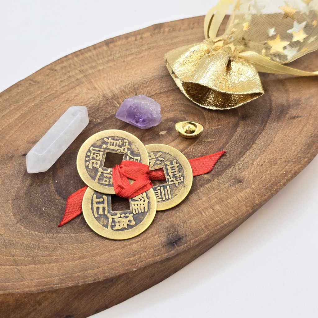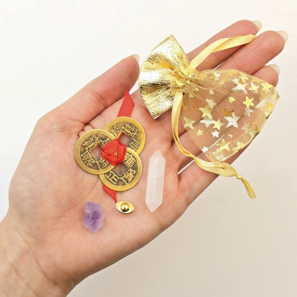 شامل سه سکه فنگشویی با گره قرمز - یک عدد امیتیست راف- یک عدد سنگ کوارتز منشوری-یک عدد کشکول ثروت ریز برنجی و کیسه طلایی برای حمل آسان همراه خود