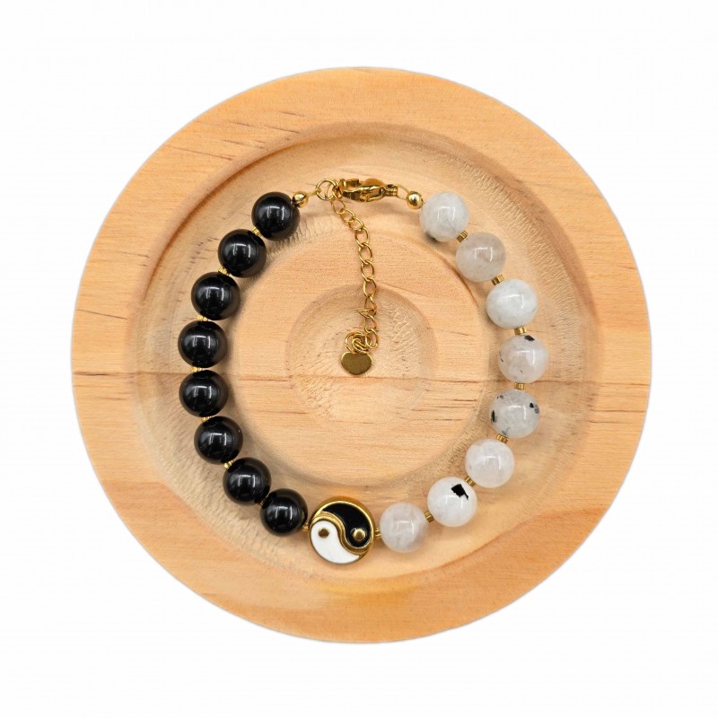 دستبند سنگ مون استون هندی و ابسیدین سیاه با پلاک یین و یانگ استیل دوطرفه